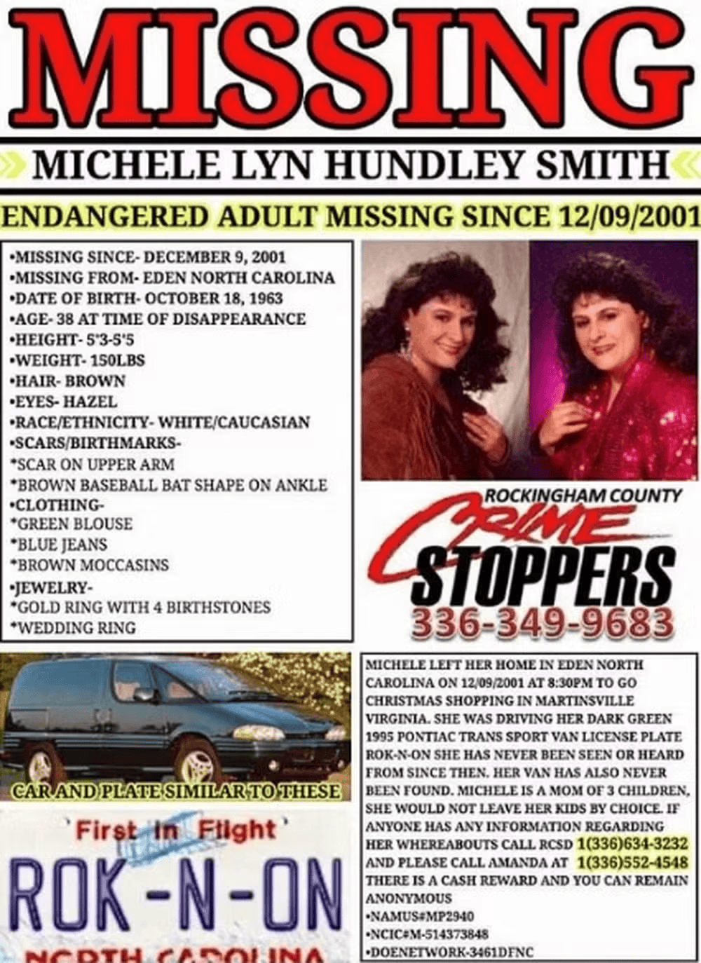 Michele Hundley Smith, que desapareceu em dezembro de 2001 após sair para fazer compras de Natal, foi encontrada viva quase 24 anos depois na Carolina do Norte, nos Estados Unidos. A localização ocorreu após o Gabinete do Xerife do Condado de Rockingham receber novas informações em 19 de fevereiro e conseguir contato com a mulher no dia seguinte.
